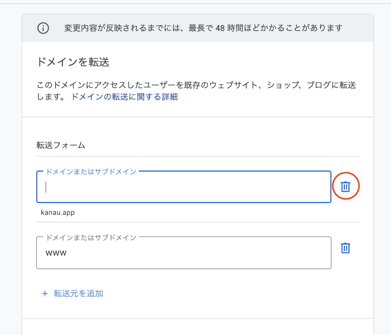どのサブドメインを、どこに転送したいのかを設定します。今回は、wwwありのアドレスをwwwなしに転送したいので、上段の空白の欄の右にあるゴミ箱アイコンをクリックします。