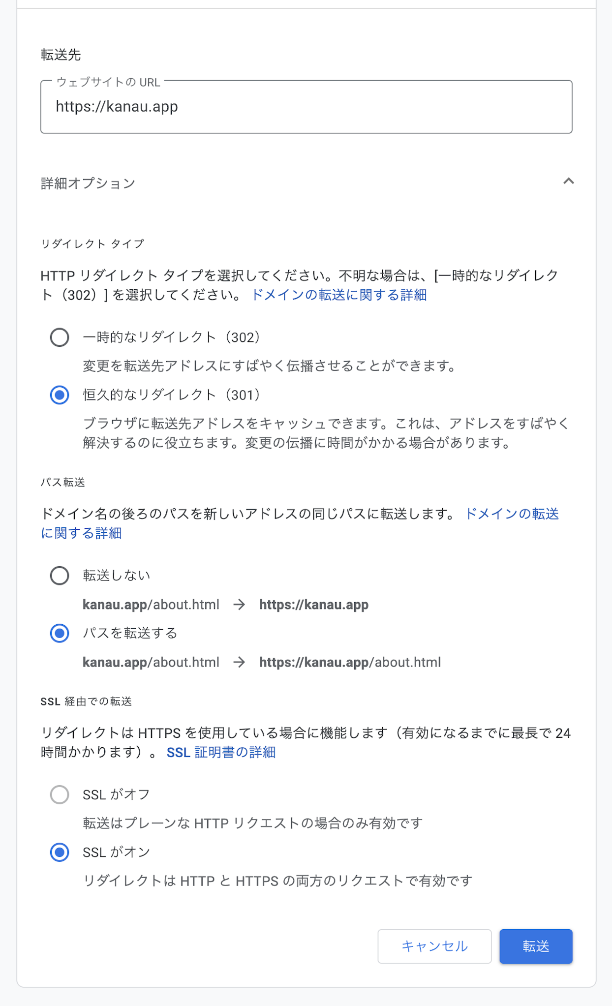 転送先には、wwwなしのURLをhttpsから入力します。URL末尾の/(スラッシュ)は不要です。